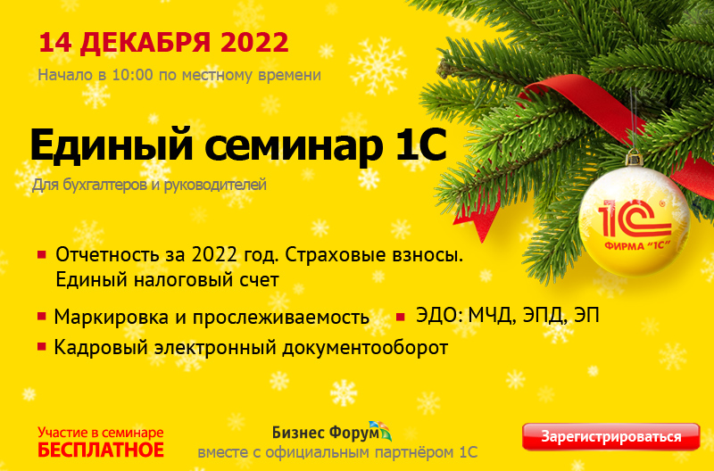 Приглашаем на Единый онлайн-семинар 1С, который состоится 14 декабря 2022г. Организатор – фирма «1С» совместно с партнерами. Участие в семинаре БЕСПЛАТНОЕ.