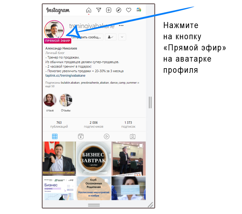 В указанное время вам нужно зайти в соцсеть Instagram на страничку тернингового центра «Альбатрос» и нажать кнопку «Прямой эфир» в шапке профиля.