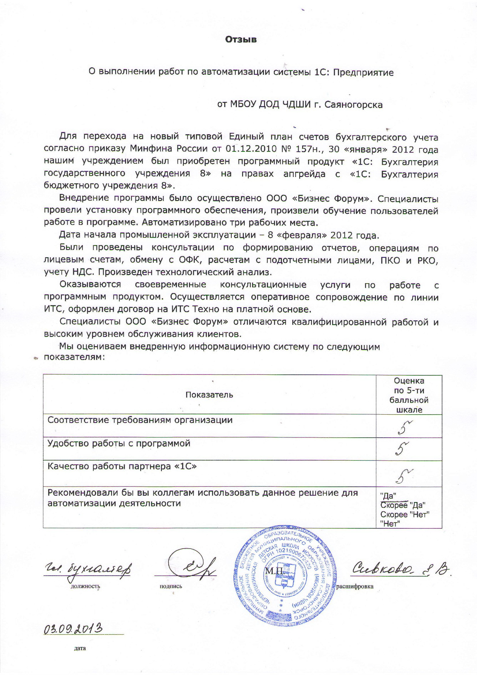 Применение "1С:Бухгалтерия государственного учреждения 8" позволила нам организовать учёт в соответствии с действующим законодательством, а также формировать достоверную бухгалтерскую отчётность в короткие сроки. Автоматизировано три рабочих места. Дата начала промышленной эксплуатации - 29 "августа" 2011 года. Специалистами ООО "Бизнес Форум" был произведен технологический анализ, а также проведены консультации по формированию отчётов, работе с кассой и т.д. Оказываются консультационные услуги по работе с программным продуктом. Осуществляется сопровождение по линии ИТС, оформлен договор на ИТС ПРОФ на платной основе.