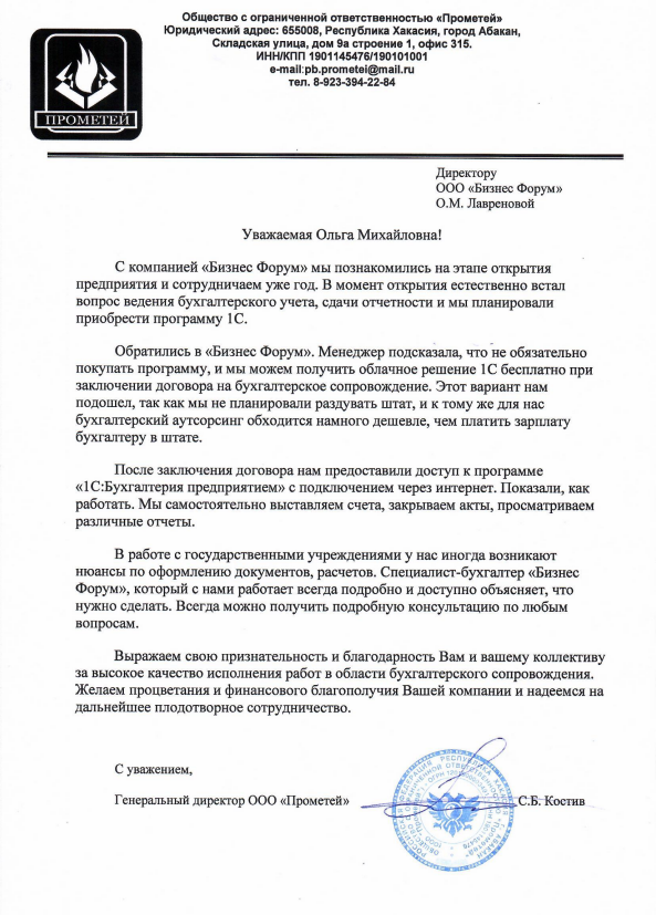 С уважением, Генеральный директор ООО «Прометей» С.Б. Костив