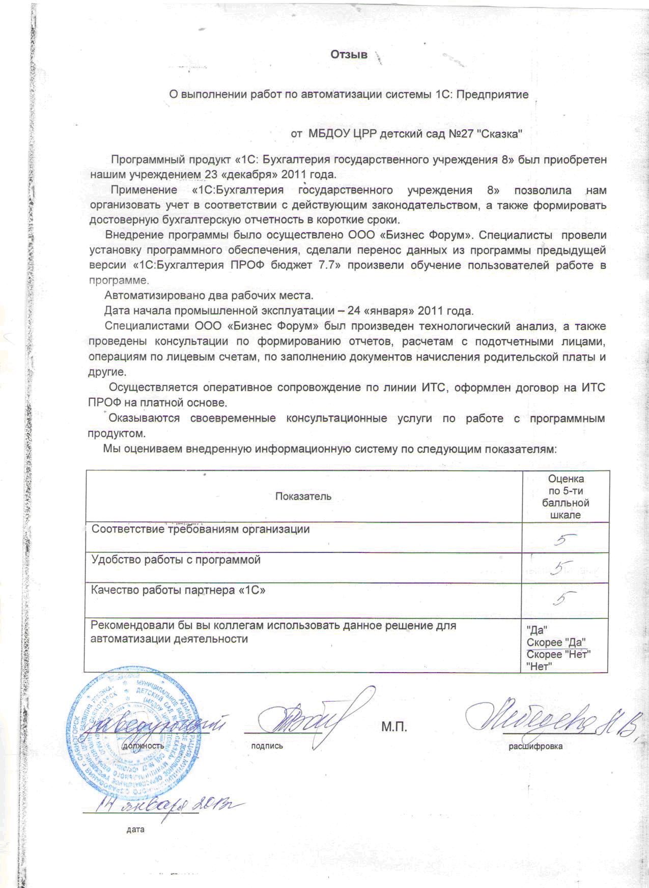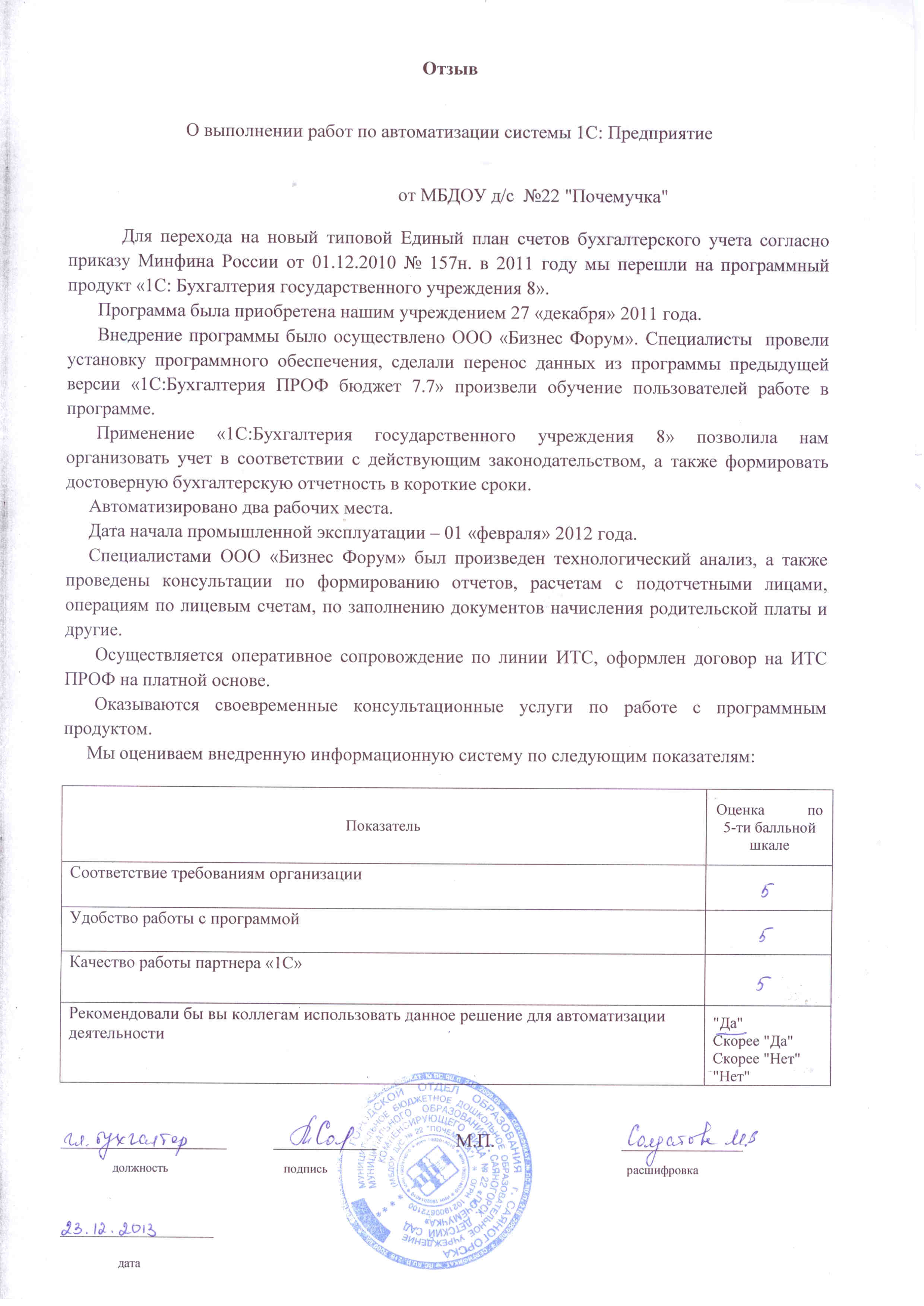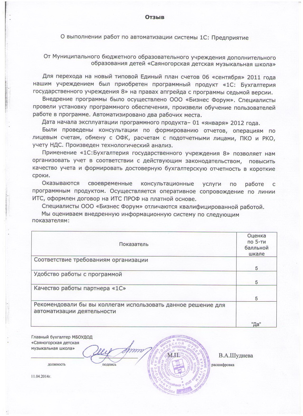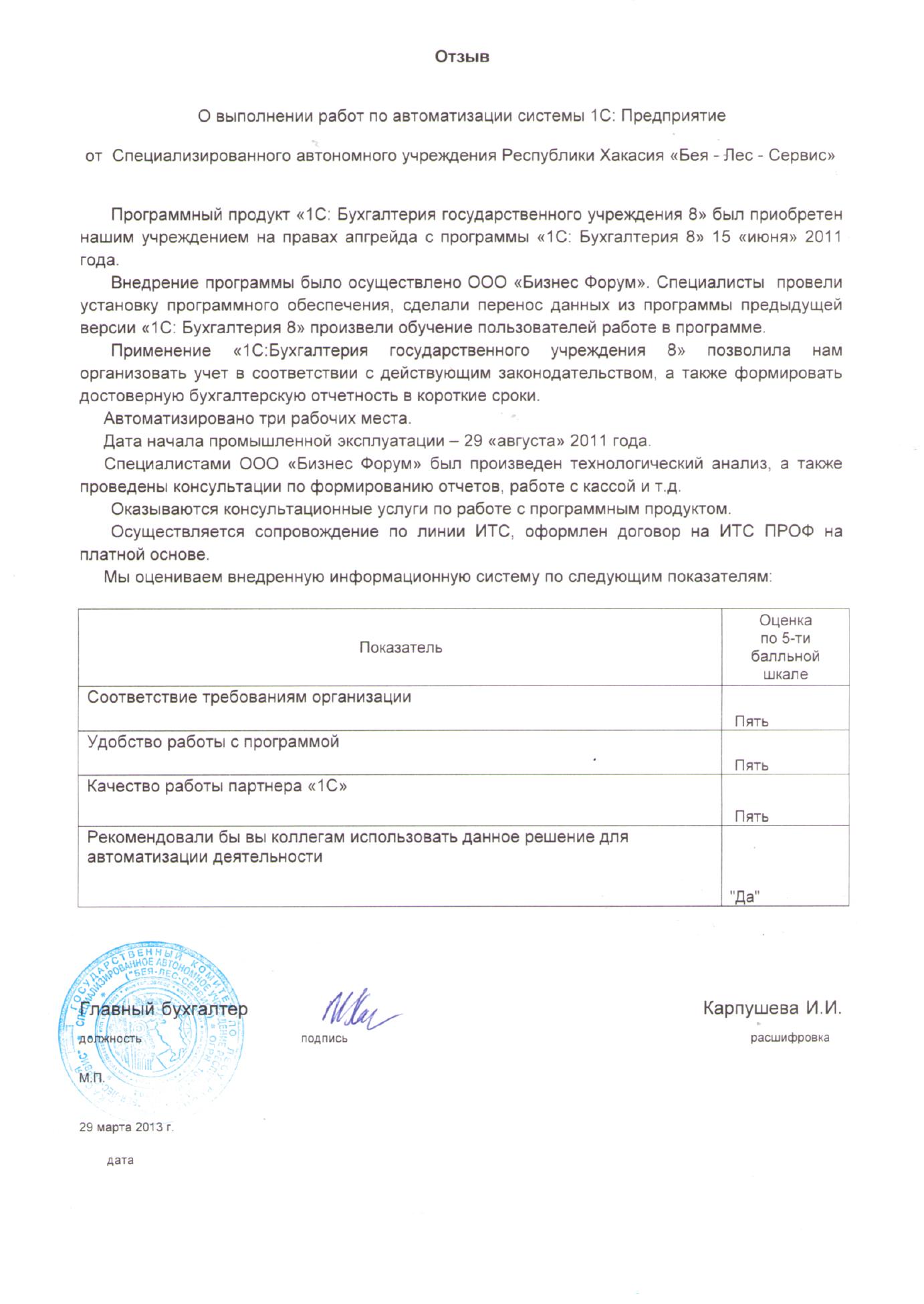Применение "1С:Бухгалтерия государственного учреждения 8" позволила нам организовать учёт в соответствии с действующим законодательством, а также формировать достоверную бухгалтерскую отчётность в короткие сроки. Автоматизировано три рабочих места. Дата начала промышленной эксплуатации - 29 "августа" 2011 года. Специалистами ООО "Бизнес Форум" был произведен технологический анализ, а также проведены консультации по формированию отчётов, работе с кассой и т.д. Оказываются консультационные услуги по работе с программным продуктом. Осуществляется сопровождение по линии ИТС, оформлен договор на ИТС ПРОФ на платной основе.